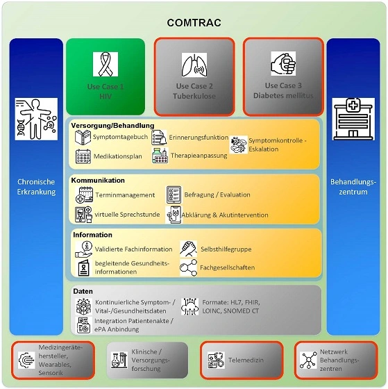 Die Zielgruppe besteht aus Patientinnen und Patienten nach einer HIV-Erstdiagnose, HIV-negative Menschen in fortlaufender ärztlicher Behandlung mit einer medikamentösen prä-Expositionsprophylaxe (PrEP) und medizinisches Fachpersonal mit HIV-Behandlung als Schwerpunkt. Das Konzept von COMTRAC sieht die Schaffung eines neuartigen interoperablen und hybriden Interaktionssystems vor, das im medizinischen Regelwerk leicht auf andere chronische Erkrankungen (z.B. Diabetes mellitus) erweitert werden kann. In erster Linie profitieren Betroffene und Behandelnde, jedoch kann auch die Wissenschaft durch kontinuierliche Sammlung von Behandlungsdaten profitieren und verbesserte Therapie-Compliance kann helfen, Behandlungskosten zu reduzieren. Als Spin off der Hochschulmedizin ermöglicht COMTRAC aktiv dort zu unterstützen und zu entlasten, wo für Betroffene und Behandelnde die größte Notwendigkeit besteht: direkt in der Therapie.