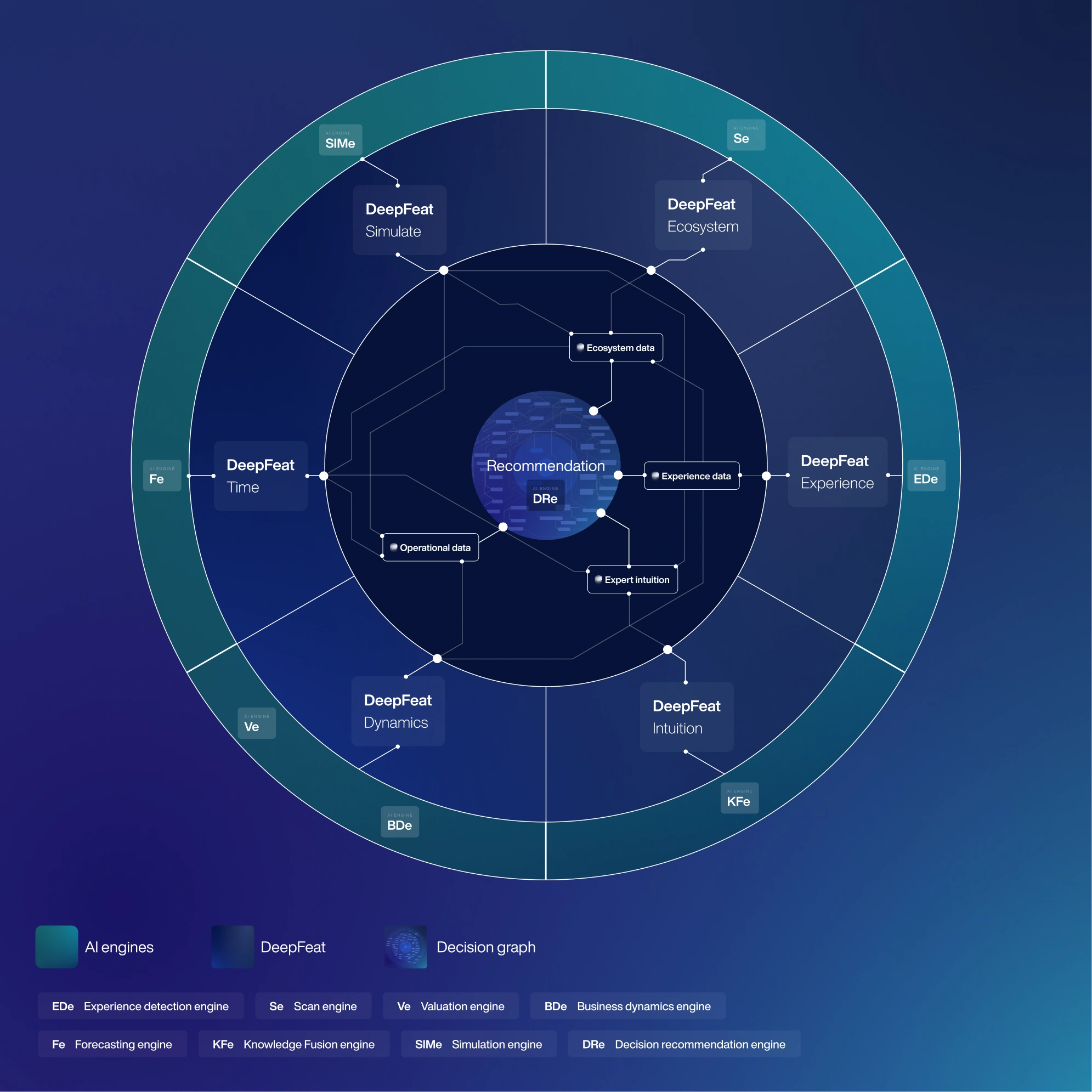 Der Anwendungsbereich der DeepFeat Technologie bei vencortex fokussiert sich darauf, komplexe Unternehmensentscheidungen unter Unsicherheit zu unterstützen. Zielkunden sind vor allem größere KMUs und Konzerne. DeepFeat dient hierbei dazu, eine Art digitalen Zwilling des Unternehmens basierend auf heterogenen Daten zu erzeugen und somit auf dieser Simulationen laufen zu lassen und unterschiedliche Machine Learning Modelle zu trainieren. Die Vision dahinter ist, das relevante Umfeld in einem Vektorraum darzustellen. Damit würde das Entscheidungsproblem eine Optimierung analog zu Videospielen / Simulationen werden.