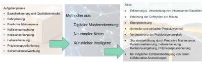 Zur Lösung kommen Methoden aus der digitalen Mustererkennung, aus dem Bereich Neuronale Netze und Künstlicher Intelligenz zum Zuge. Daten für diese Methoden werden aus digitalen Zwillingen und realen Sensoren- und Aktoren generiert und ausgewertet.