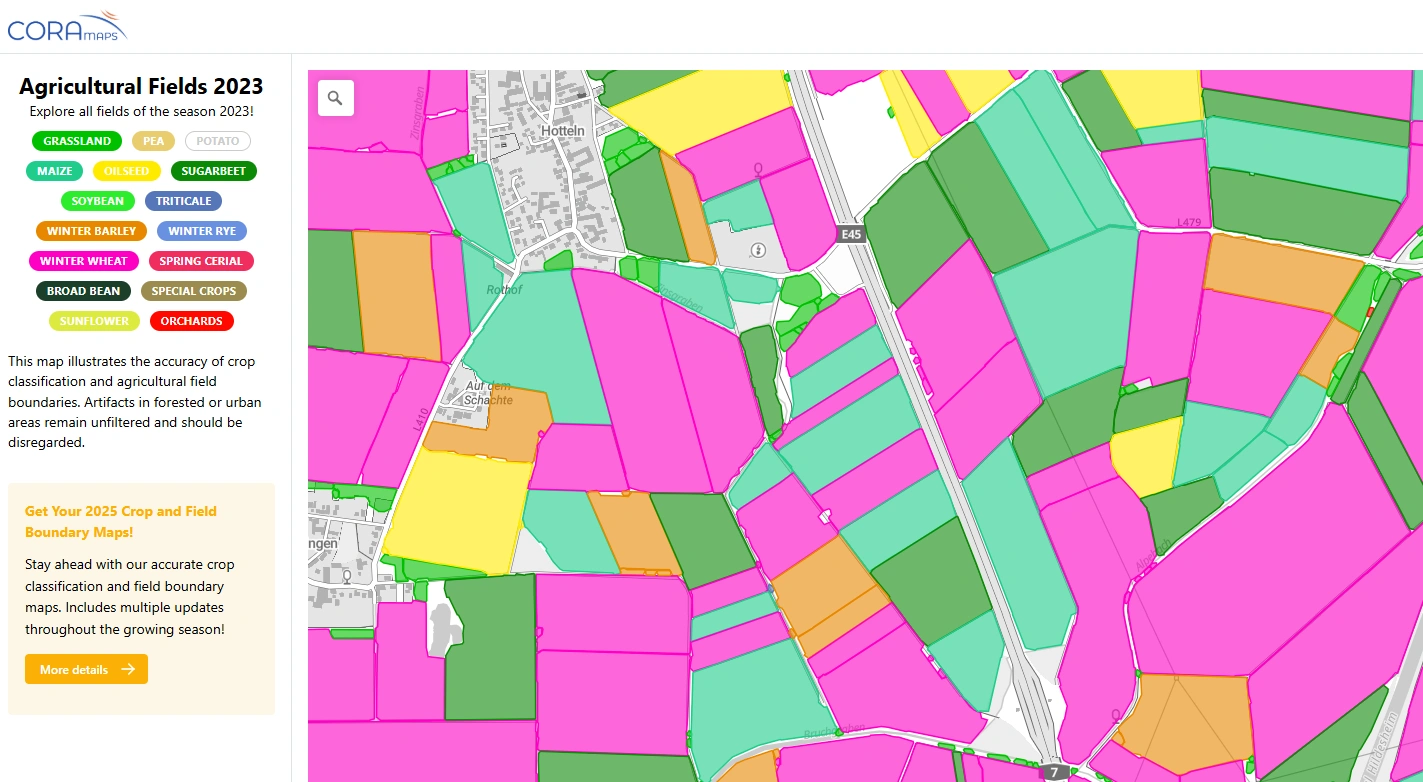 Mit der Anwendung neuester KI-Technologie werden innovative Produkte entwickelt, die das Monitoring landwirtschaftlicher Flächen revolutionieren und weltweit skalierbar sind. Die von CORAmaps mittels Satellitendaten erzeugten Feldfruchtkarten bilden hierbei einen wichtigen Beitrag zur Digitalisierung der Landwirtschaft.