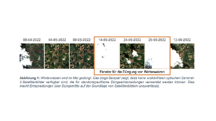 Die Düngung landwirtschaftlicher Kulturen ist an einen kritischen Zeitraum von i. d. R. 2-Wochen gebunden. Außerhalb dieses Zeitraums vermindern sich Erträge, während Nitratauswaschungen und N2O-Emissionen zunehmen. Die konventionelle Bestimmung der Düngemengen (Pflanzenproben, Bodenproben) ist zeit- und kostenaufwendig. Die absolute (kg/ha) Düngeempfehlung durch Fernerkundung ist ein Novum, lediglich die Hemmnisse, welche durch Wolkendecken entstehen, stellen eine Hürde für die Praxis dar.