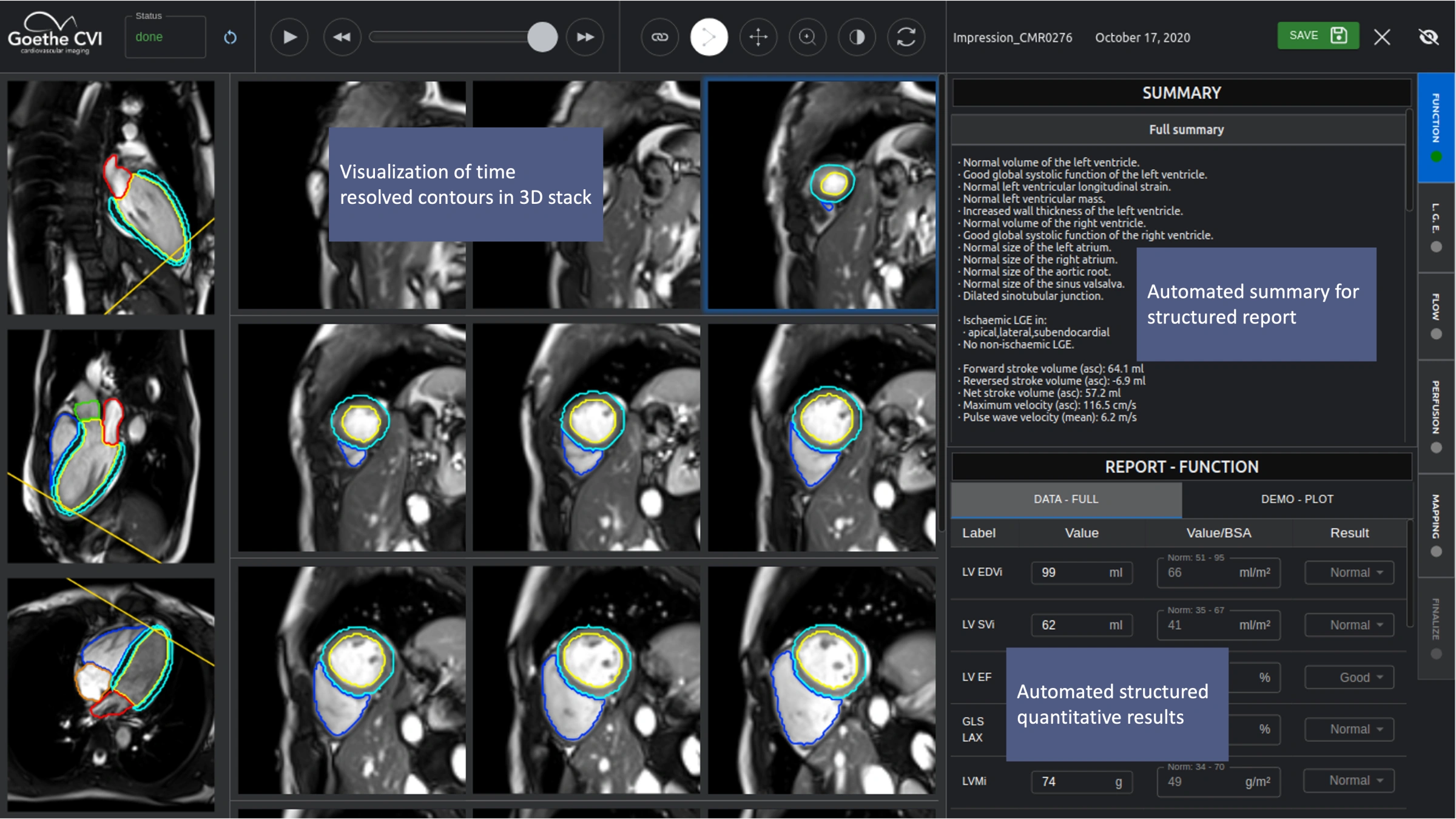 Die Goethe CVI Software ist einzigartig, da sie alle Prozesse der Magnetresonanztomographie des Herzens automatisiert, die Ergebnisse einzelner Module miteinander verknüpft und mit jahrzehntelanger klinischer Evidenz verbindet und dadurch eine bisher nicht erreichte Genauigkeit mit minimalen Nutzer-Eingriffen ermöglicht. Dabei werden eigene validierte Bildgebungs- und Auswerteverfahren genutzt und alle Arbeitsschritte exakt aufeinander abgestimmt. So wird eine bisher nicht erreichte klinische Präzision mit extrem kurzen Messzeiten verbunden, die von vielen Zentren auch mit geringer Spezialisierung kostengünstig angeboten werden können. Bei allen Prozessen werden neueste machine learning Verfahren eingesetzt, um bisher von Menschen durchgeführte Arbeitsschritte und Spezialisierung automatisiert nachbauen und verbessern zu können. Ziel ist ein vollautomatisches System, dass die Magnetresonanztomographie des Herzens so vereinfacht, das es als Routineverfahren schon früh in der individuellen Abklärung von Patienten (oder auch gesundheitsbewussten Menschen) genutzt werden kann.