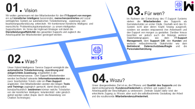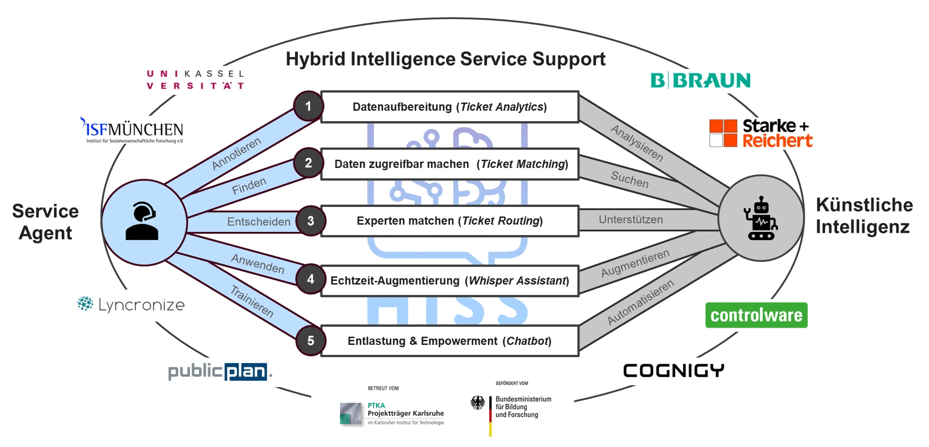 Ziel des Forschungsprojekts HISS ist die Entwicklung eines auf hybrider Intelligenz basierenden nutzerzentrierten Dienstleistungssystems für den IT-Support, das eine lernfähige KI einsetzt.