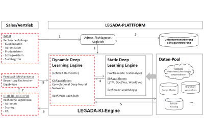 Vertrieb und Kundenmanagement sind in den meisten Unternehmen ein strategischer und kritischer Erfolgsfaktor. Die Recherche nach hochwertigen Kontakten (Leads) ist daher von großer Bedeutung für das Neukundengeschäft. LEGADA löst die personalintensive Sichtung, Nachrecherche und Bewertung von Kontakt-Daten aus vielen heterogenen, teils unstrukturierten Datenquellen ab. Der disruptive Ansatz von LEGADA besteht in der Entwicklung einer KI-Engine für Daten-getriebene Lead-Generierung, die dem Vertrieb automatisiert, selbstlernend und interaktiv mit breiter Marktabdeckung hochwertige und bewertete Kontakte liefert. Die im Hintergrund arbeitende, selbstlernende KI-Engine wird interaktiv vom Nutzer gesteuert, der die Suchergebnisse iterativ durch die Bewertung der gefundenen Treffer beeinflussen und verbessern kann.