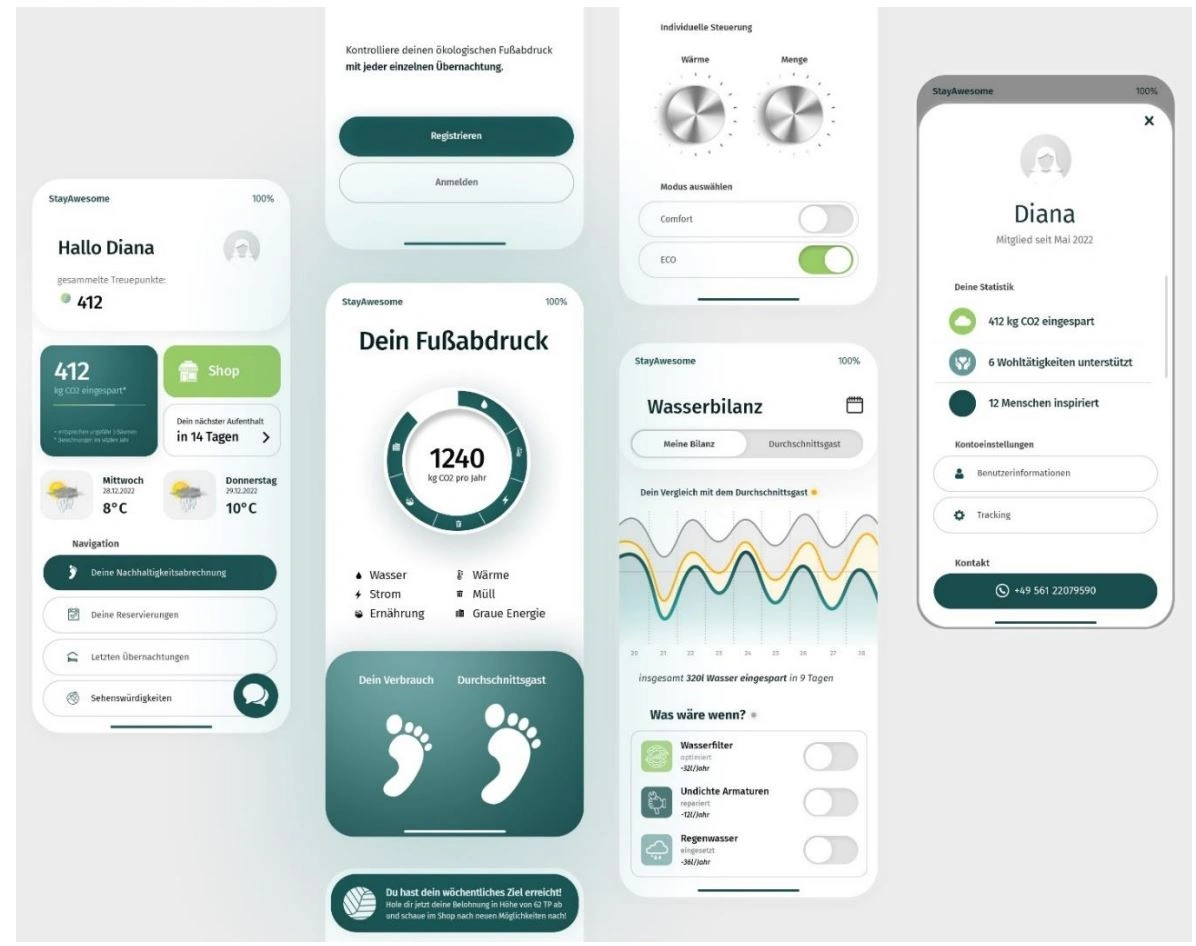 Die Stay Awesome GmbH betreibt nachhaltige Ferienunterkünfte. Wir möchten unseren Gästen nicht nur eine nachhaltige Reise ermöglichen, sondern sie auch über Ihren Aufenthalt hinaus informieren und ihr nachhaltiges Leben vereinfachen. So entstand die Idee zu einer personalisierten und automatischen Nachhaltigkeitsabrechnung mit What-If Funktion. Das UPP Kassel unterstützt uns bei der CO2-Bilanzierung von Gebäuden und die Veli GmbH stellt smarte Sensorik zur Erfassung von Wasser-, Strom- und Wärmemengen.