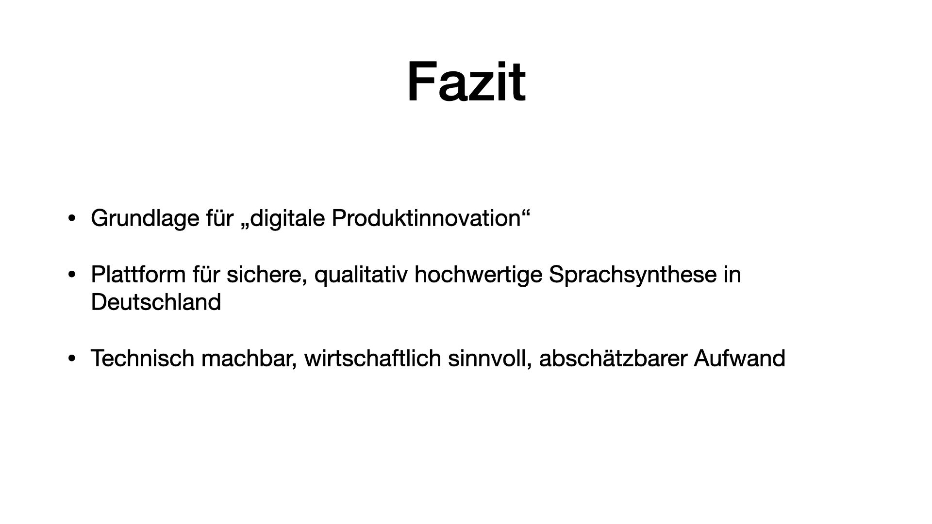 Mit der Machbarkeitsstudie haben wir das übergreifende Ziel verfolgt, eine KI-Plattform zu entwickeln, die nicht nur die sprachlichen und rechtlichen, sondern auch die technischen Anforderungen der professionellen Sprachproduktion erfüllt. Der Aufwand für die Erstellung eines effizienten Lernkorpus, mit dem sich hochwertige KI-Sprache generieren lässt, ist nun abschätzbar.