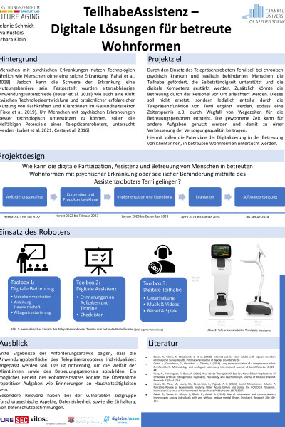 Ziel des Projekts TeilhabeAssistenz - Digitale Lösungen für betreute Wohnformen ist es, die Potenziale der Digitalisierung in der Betreuung von Menschen mit chronischen psychischen Erkrankungen (Klientinnen und Klienten), die in betreuten Wohnformen leben, aufzuzeigen und zu nutzen. Das robotische System Temi verfügt über Basisfunktionen wie der autonomen Navigation und kann zielgruppenspezifisch und abhängig vom Anwendungskontext programmiert werden. Im Rahmen des Projekts wurde Temi mit einer adressatengerechten Software ausgestattet mit den Toolbox-Modulen „Digitale Teilhabe“, „Digitale Assistenz“ und „Digitale Betreuung“ entwickelt. Dadurch wird bei den Klientinnen und Klienten die Teilhabe gefördert, die Selbstständigkeit unterstützt sowie die digitale Kompetenz gestärkt. Zusätzlich kann die Versorgungsqualität verbessert werden. Fachkräfte sollen nicht ersetzt, sondern lediglich anteilig durch die Funktionen des Roboters ergänzt werden. Wesentliche Herausforderungen bestanden darin datenschutzkonforme und ethisch sensible Lösungen für eine vulnerable Zielgruppe in einem schützenswerten Bereich der Gesundheitsversorgung zu entwickeln.