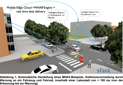 Die Wahrnehmung aller Verkehrsteilnehmer und auch der aktuellen Advanced-Driver-Assistance- Systeme ist üblicherweise auf die persönliche Perspektive beschränkt. Viele Unfälle geschehen, weil die Verkehrsteilnehmer einander übersehen, Geschwindigkeiten, Abstände oder Bewegungen falsch einschätzen und dann nicht mehr rechtzeitig reagieren können. Für einen externen Betrachter, der die Bewegungspfade aller Verkehrsteilnehmer beobachtet, wären viele Kollisionen hingegen leicht vorhersehbar und könnten vermieden werden. Im Projekt wird ein Verkehrswarnsystem entwickelt, das genau diese Rolle übernimmt. Die Mulitmodal-Hazard-Avoidance (MHAV) wertet erstmals Geo- und Bewegungsdaten direkt auf den Smartphones der Verkehrsteilnehmer aus, um deren Bewegungsmuster abzuleiten und diese über eine Edge Cloudanwendung mit anderen Bewegungen im Umfeld abzugleichen und mögliche Kollisionen zu prognostizieren. Betroffene Personen oder Fahrzeuge können so gewarnt werden, noch bevor die Gefahrensituation entsteht, und frühzeitig reagieren.