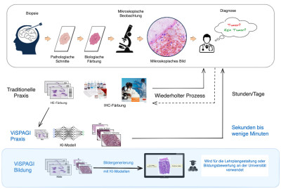 ViSPAGI zielt darauf ab, die Arbeitsabläufe für die moderne digitale Pathologie zu revolutionieren und stellt eine bedeutende Abkehr von der traditionellen, zeitaufwändigen Methode der Gewebefärbung dar. Durch den Einsatz modernster KI-Technologien für die virtuelle Färbung rationalisiert ViSPAGI den Pathologieprozess erheblich und ermöglicht die schnelle Umwandlung von ungefärbten oder mit Hämatoxylin und Eosin (H&E) gefärbten Gewebeschnitten in eine Vielzahl histopathologischer Färbungen. Dieser Durchbruch beschleunigt nicht nur den diagnostischen Zeitplan, gibt der Digitalisierung in diesem Arbeitsbereich eine neue Dimension, sondern reduziert auch die Exposition gegenüber gefährlichen Chemikalien und stellt damit einen bedeutenden Fortschritt in der medizinischen Diagnostik dar.